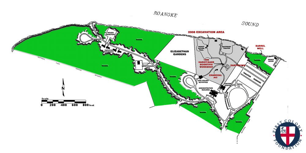 A map of Fort Raleigh National Historic Site showing the locations of recent excavations.