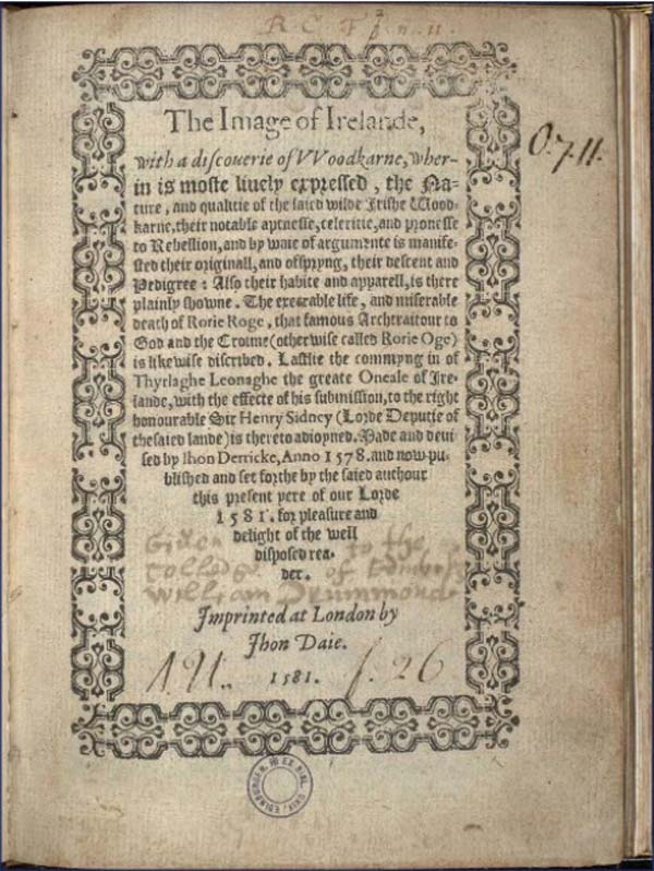 The Lord Deputy (Governor) of Ireland then, Sir Henry Sidney was successful in suppressing rebellions. His soldiers proudly brought back the severed heads of leading rebels, as seen in the following portion of an image from Derrick’s 1581 illustrated account of those conflicts, The Image of Irelande, with a discouerie of Woodkarne.